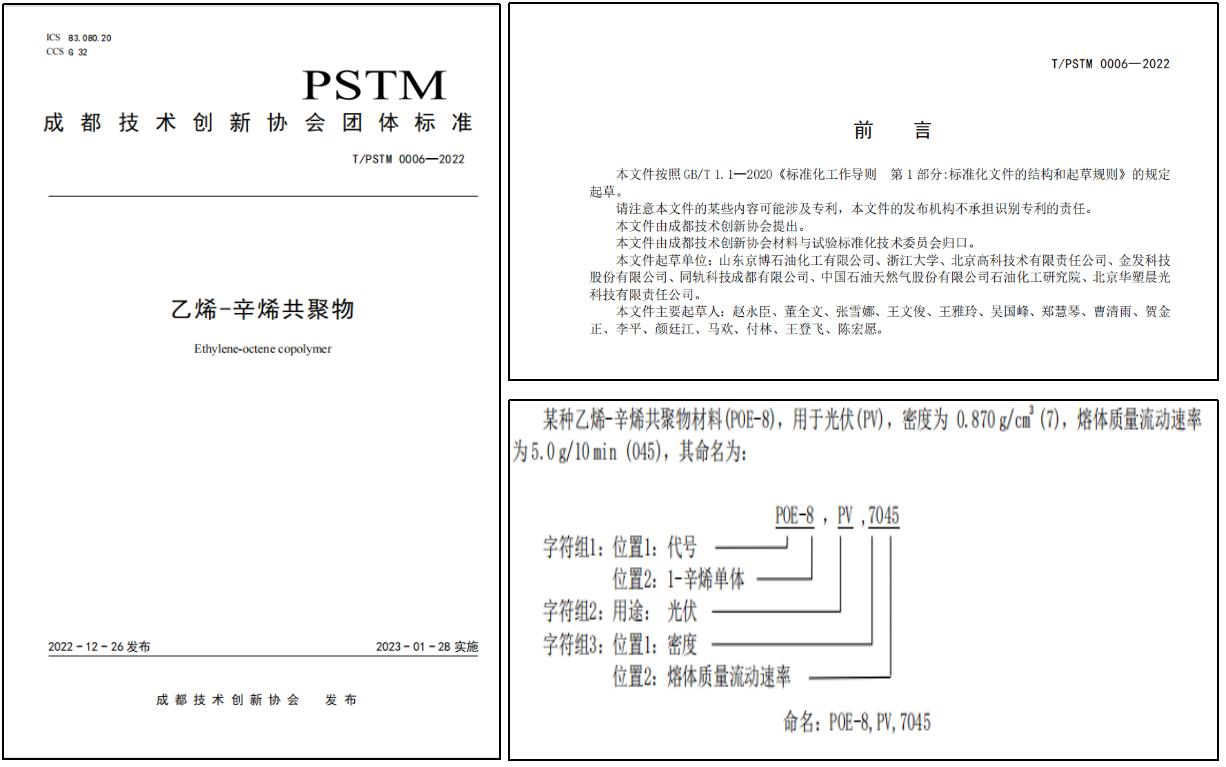 該標準由京博石化牽頭起草,由成都技術創(chuàng)新協(xié)會材料與試驗標準化技術委員會歸口,浙江大學、北京高科技術有限責任公司、金發(fā)科技股份有限公司、同軌科技成都有限公司、中國石油天然氣股份有限公司石油化工研究院、北京華塑晨光科技有限責任公司共同參與起草,于2023年1月28日正式實施。標準規(guī)定了乙烯-辛烯共聚物的命名、要求、試驗方法、檢驗規(guī)則、標志和隨行文件、包裝、運輸和貯存。標準適用于由乙烯與 1-辛烯通過溶液聚合工藝所生產(chǎn)的乙烯-辛烯共聚物,共規(guī)定了通用及光伏用途的5種牌號產(chǎn)品,選取熔體質(zhì)量流動速率最具代表性的三個標稱值范圍進行要求,可代表市面上大多數(shù)產(chǎn)品要求。