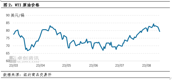 美原油價格從8月至今展現(xiàn)出沖高回落走勢,價格重心仍高于7月均值,對塑料市場起到托底作用。具體看,WTI原油主力合約價格從8月1號的80美元/桶升至10號的84美元/桶,最后下跌至8月17日的79美元/桶。上漲因素來源于8月3日沙特宣布把100/桶的減產(chǎn)計劃延長至9月,同時某國宣布將在9月繼續(xù)限制出口,進一步鞏固了市場供應(yīng)偏緊預(yù)期。同時美國勞工部公布CPI數(shù)據(jù)低于市場預(yù)期,9月不加息可能性增加,導(dǎo)致原油價格上漲。后續(xù)市場連續(xù)四個交易日走弱,主要在于市場對于我國經(jīng)濟增長的不確定性以及對于美國進一步加息的擔(dān)憂。綜合來看,原油作為成本端對塑料市場的托底效果正在邊際走弱。