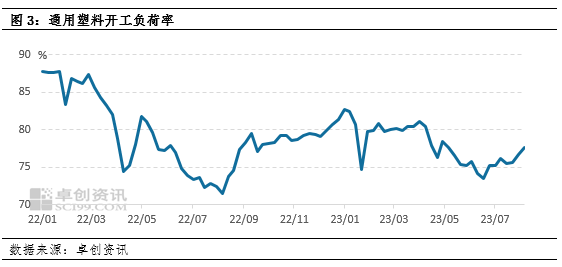 從行業(yè)角度來看,2023年7月我國塑料制品產(chǎn)量為651萬噸,環(huán)比下滑2.25個百分點,在去年基數(shù)較低的情況下,累計同比增長0.5%,更微觀角度來說,我國塑料下游綜合開工負荷率有所下降,表明了我國塑料產(chǎn)品需求有所下移。