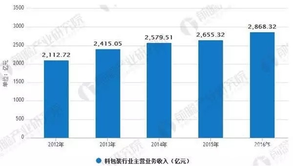 中國塑料包裝行業(yè)規(guī)模龐大,近年來保持持續(xù)穩(wěn)定增長。據(jù)前瞻產(chǎn)業(yè)研究院發(fā)布的《塑料包裝行業(yè)產(chǎn)銷需求與投資預(yù)測分析報告》數(shù)據(jù)顯示,2016年中國塑料包裝行業(yè)實現(xiàn)產(chǎn)品銷售收入2868.32億元,同比增長8.02%,近5年復(fù)合增長率達7.94%。